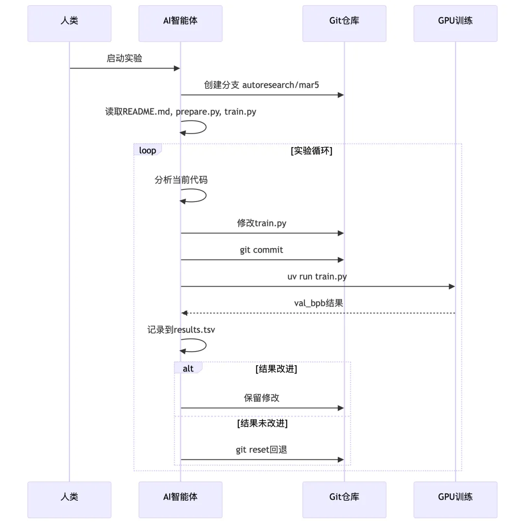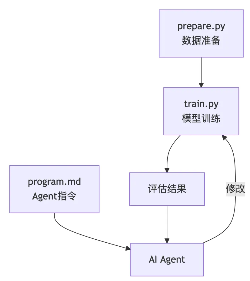 人类不再直接编写代码 人类定义研究目标和评估标准 AI Agent自主设计实验、修改代码、评估结果 人类只需在开始时设置规则,之后可以"睡大觉"