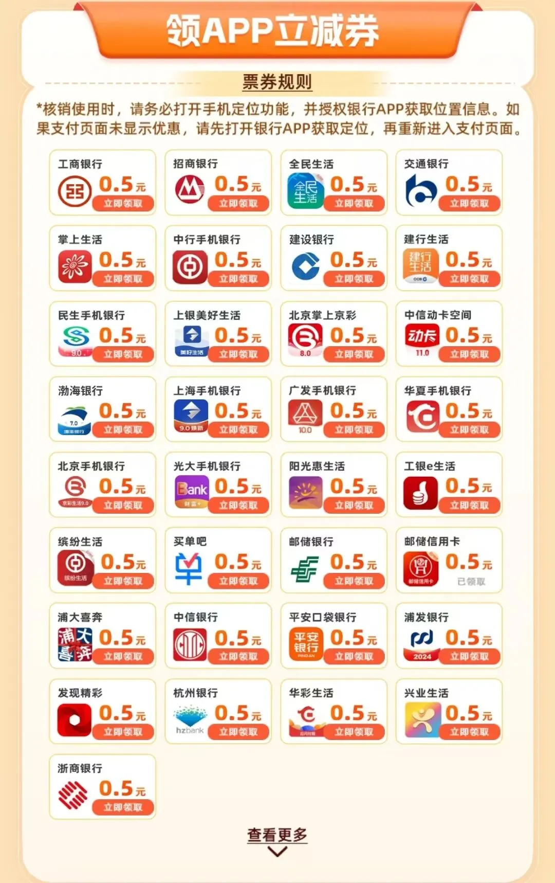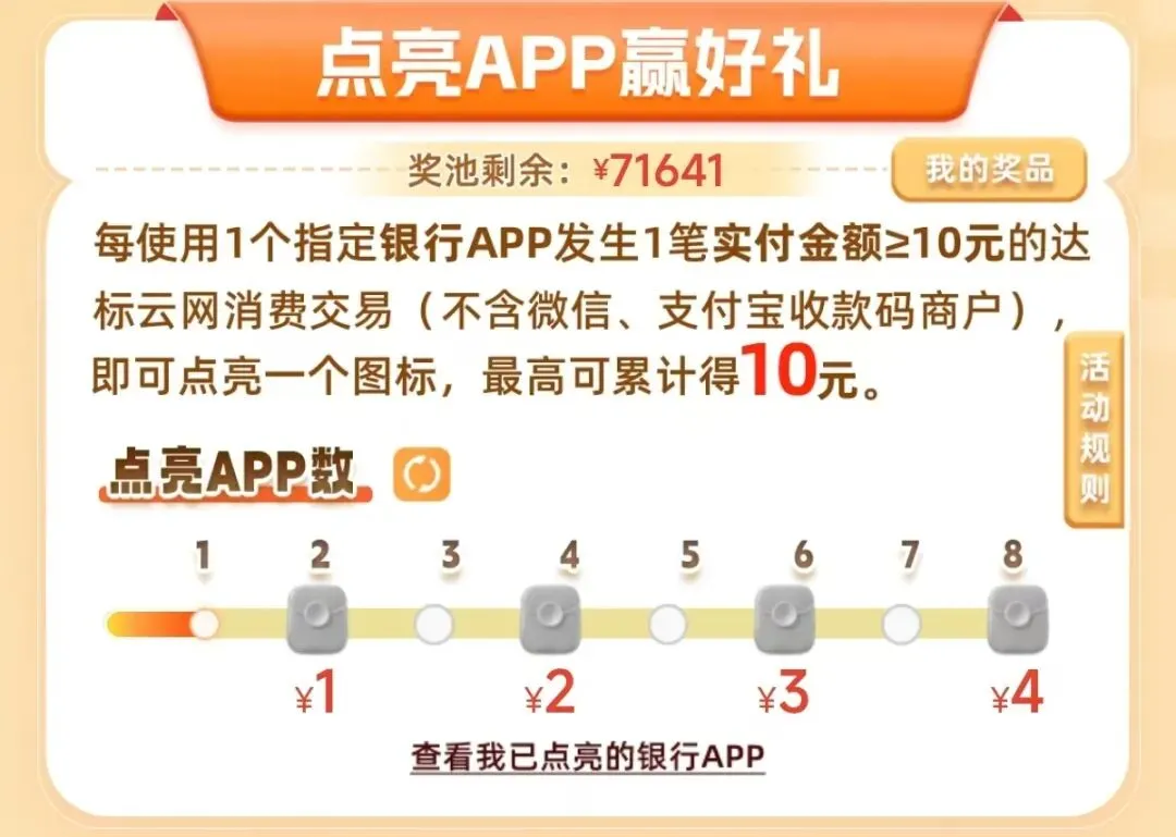 银行APP优惠有两个子活动,一个是“点亮APP赢好礼”,另一个是领APP立减券, 最优解是先领APP立减券,再去点亮对应APP,组合拳一趟完成两个任务;