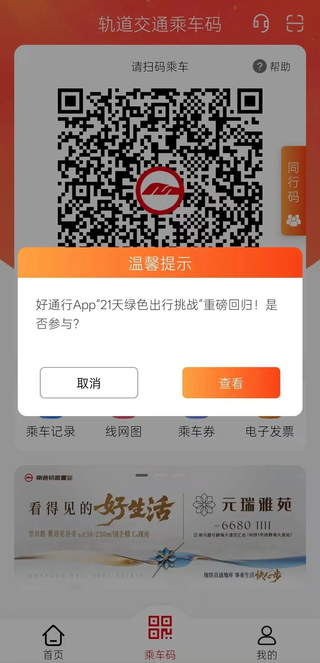 3.使用App扫码乘坐南通轨道交通。行程结束后,系统将自动统计您的 “绿色天数”。