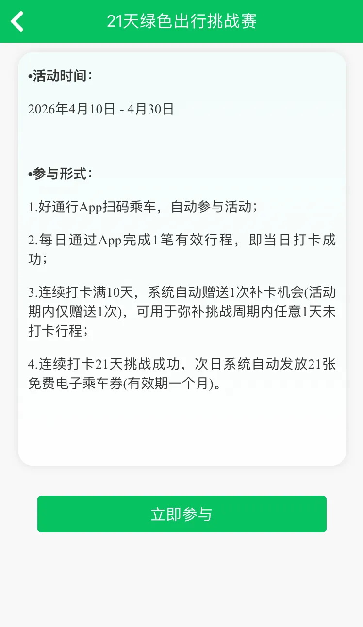 2.首页进入活动页面,或打开乘车码页面时会显示参与弹窗,点击“立即参与”即可开启挑战。