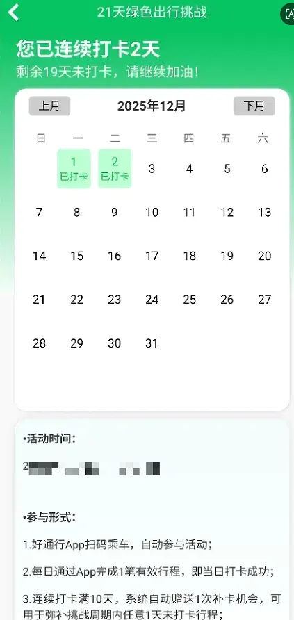 1.从参与当天起,每日在App完成1笔完整的行程(即进站+出站),即可算作当日打卡成功。您的打卡日历将在App内清晰展示, 您随时可查询打卡情况。