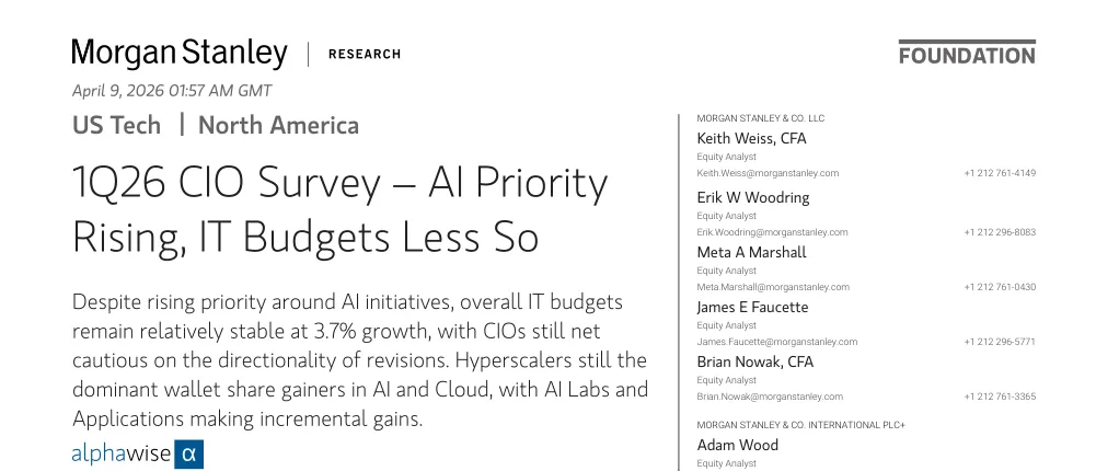 大摩他们每个季度做一次的 CIO 调查,1Q26 版本,100 个美国和欧洲的 CIO,问他们 2026 年的 IT 预算到底怎么花。