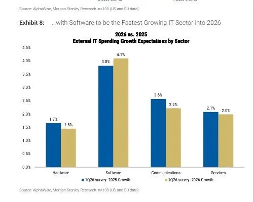 四个大类里——软件、硬件、通信、服务——只有软件是加速的。软件预算预期增长 4.1%,比 2025 年的 3.8% 提速 28 个基点,是四个类别里唯一加速的。硬件 1.5%(减速 21 个基点)、通信 2.2%(减速 35 个基点)、服务 2.0%(减速 9 个基点),全线在放缓。