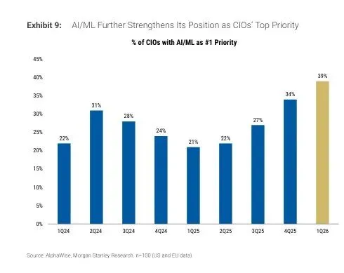 AI/ML 在 CIO 优先级列表上继续霸榜——17.7% 的 CIO 把它列为前三优先级(比上季度涨了 133 个基点),39% 的 CIO 把它列为第一优先级(从上季度的 34% 涨到 39%)。排在后面的安全软件才 10.7%,数字化转型 9.3%。差距在拉大。