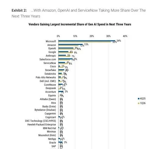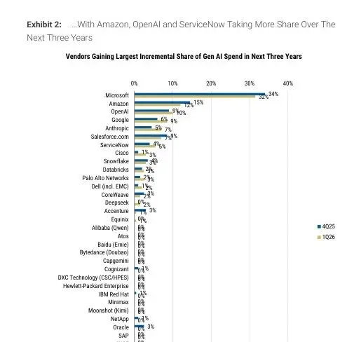 接下来重点关注两件事:一是 Q1 财报季里微软和亚马逊的云收入增速,看 CIO 嘴上说的和实际花的是不是一回事;二是 agentic 这条线在下个季度调查里有没有更多厂商突破个位数——如果三个月后还是微软一家 40%+,那这个市场的格局基本就定了。