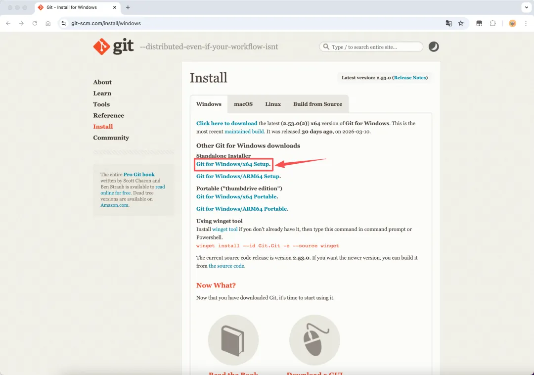打开 Git 官方下载地址:https://git-scm.com/download/win页面会自动识别系统,点击下载对应安装包(默认 64 位)。