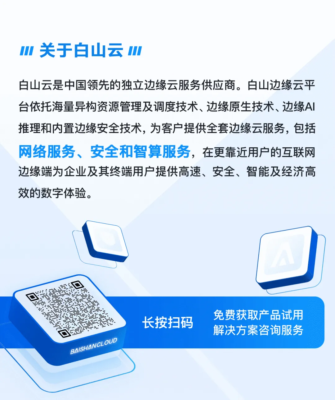 作为中国领先的独立边缘云服务提供商,白山云长期深耕边缘计算领域,构建起网络、安全和智算能力一体化的全球边缘云平台。此次入选“中国边缘计算企业20强”,是行业对白山云全球边缘基础设施布局、边缘AI技术创新及产业实践落地等方面综合实力的重要认可。