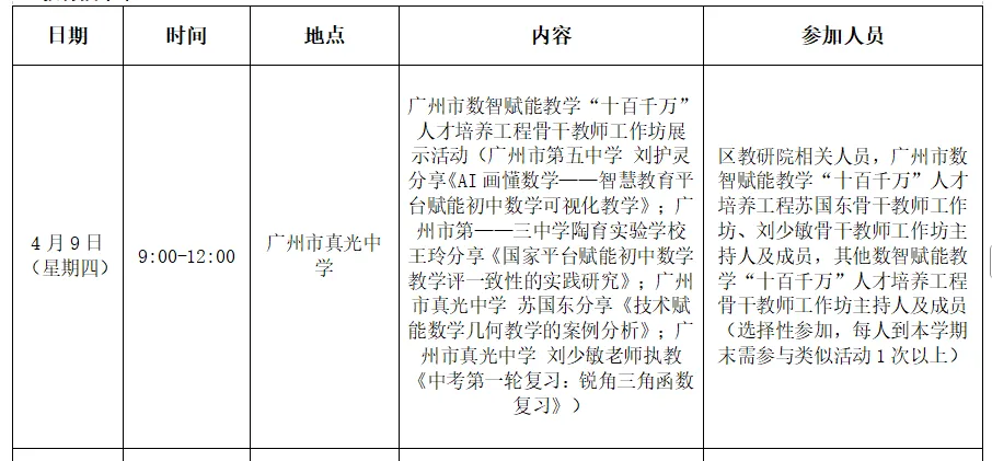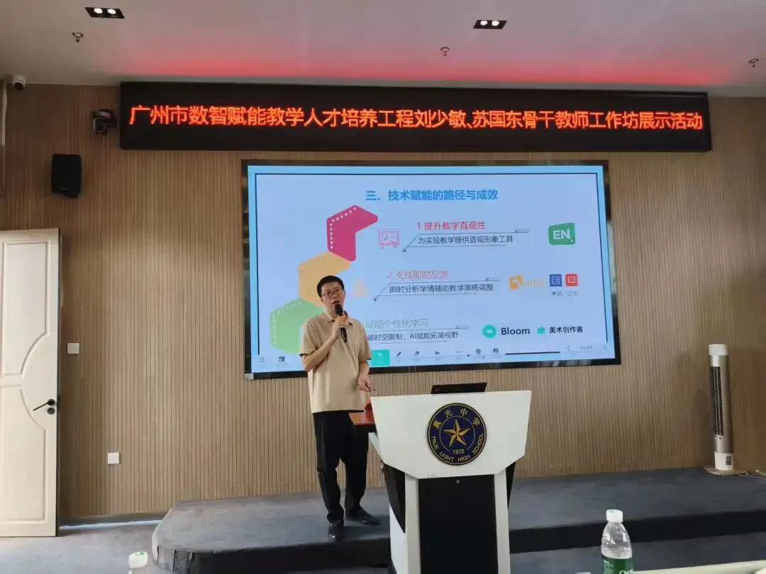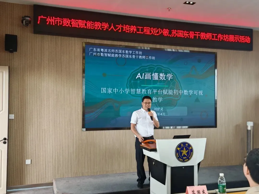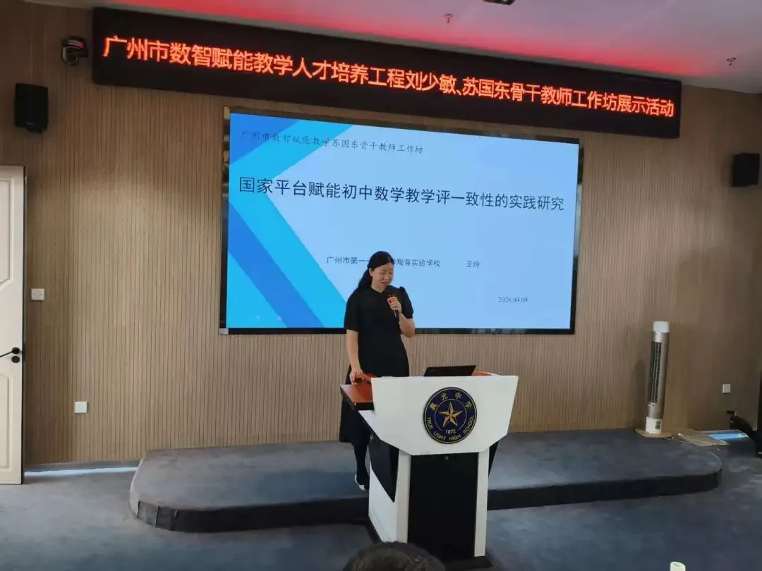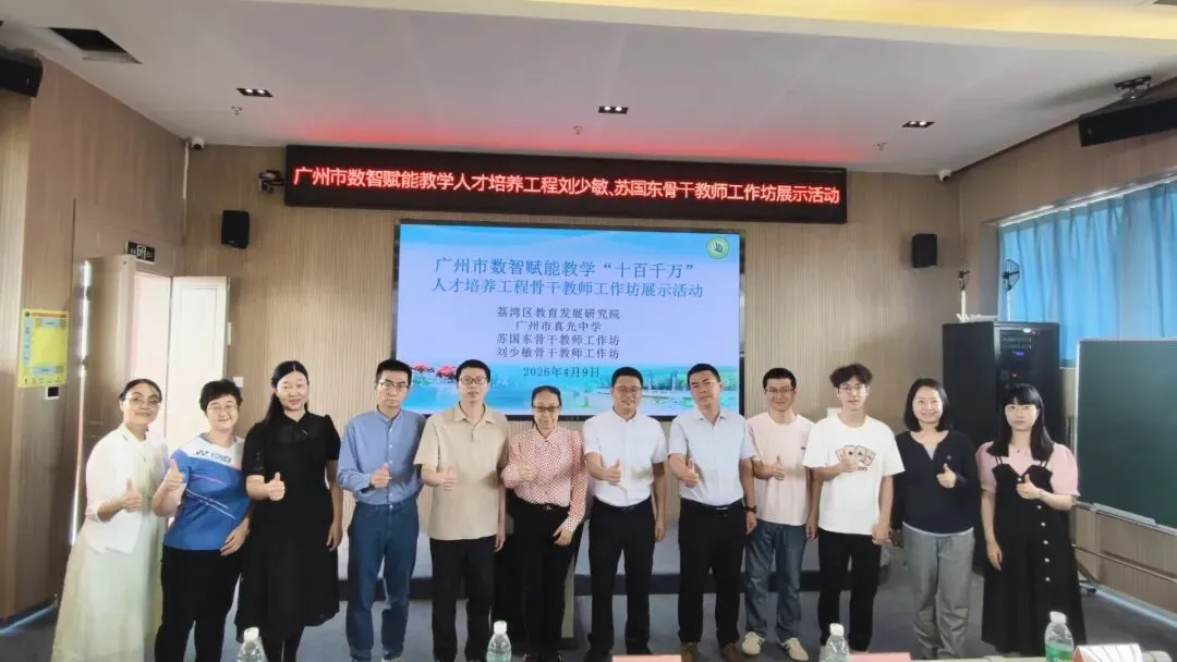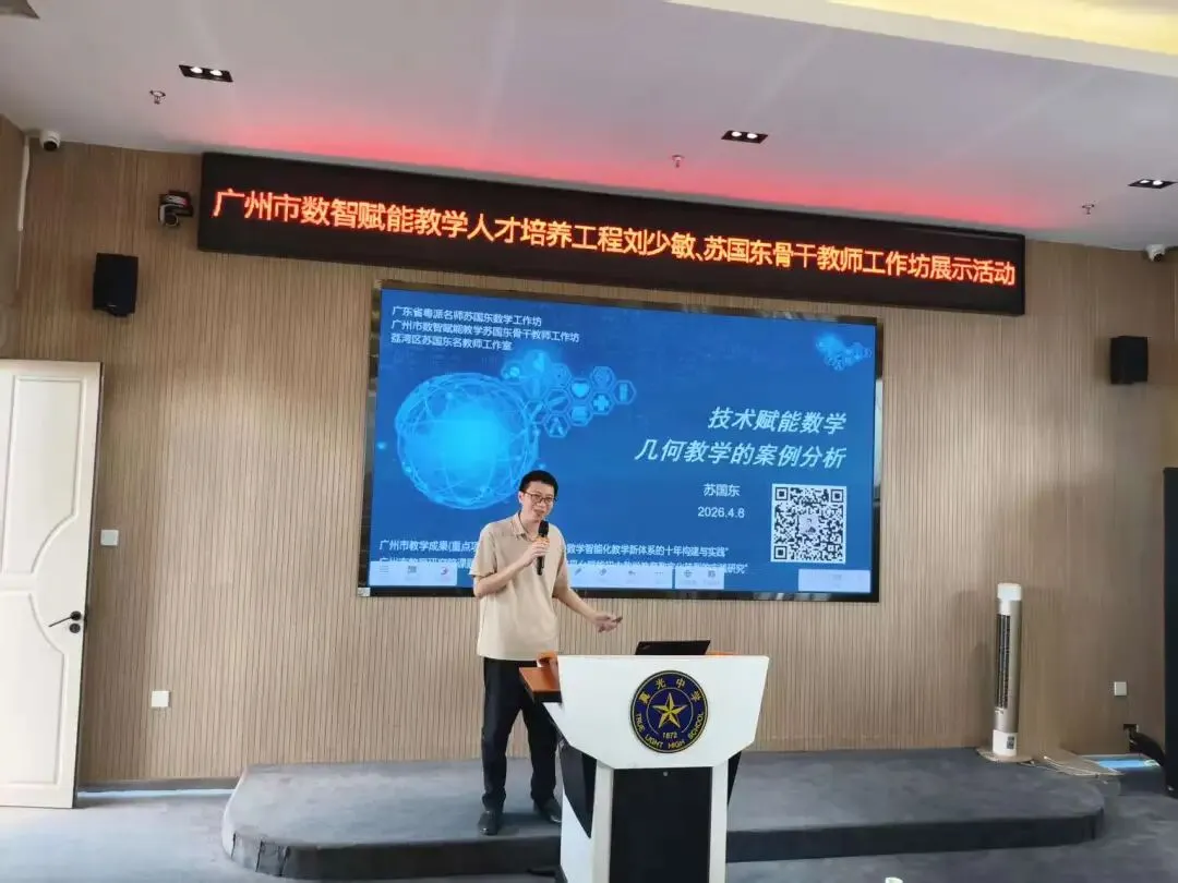 2026年4月9日上午,广东省粤派名师苏国东数学学科工作坊、广州市数智赋能教学苏国东及刘少敏骨干教师工作坊、荔湾区苏国东名教师工作室联合研修展示活动在广州市真光中学初中部本部校区顺利举行。本次活动以“技术赋能数学教学,数智助力课堂提质”为主题,聚焦信息技术与初中数学深度融合,通过专题讲座、课例展示、经验分享等形式,为区域数学教师搭建了交流学习、共同成长的优质平台,全体坊室成员及骨干教师代表参与本次研修。