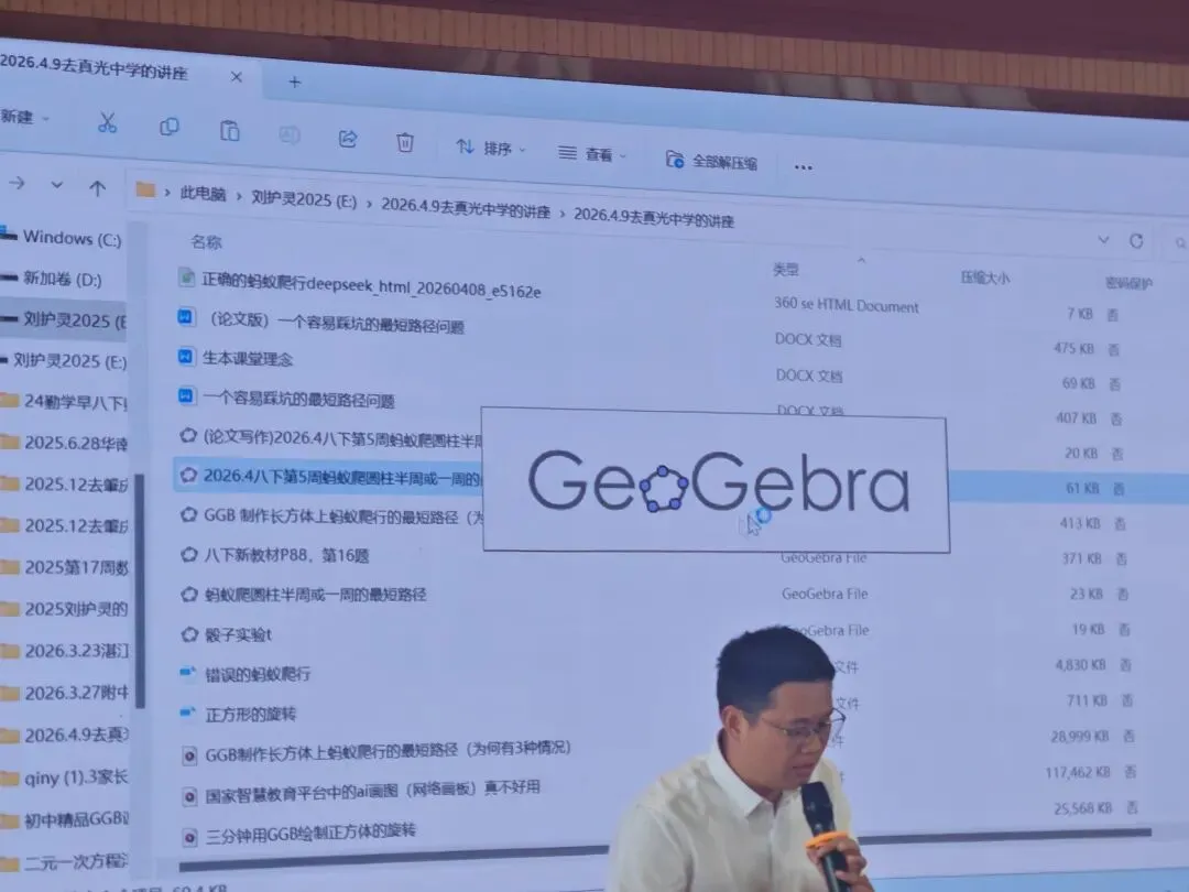 讲座中,刘护灵老师明确提出:信息技术融合数学教学的初心,是把课堂还给学生。他强调,国家中小学智慧教育平台、AI绘图、GeoGebra等工具绝非炫技手段,而是服务学生观察、思考、表达、创造的“学习脚手架”。随后,他结合丰富课例,从情境创设、动态呈现、归纳探究、互动教学、兴趣激发、自主探究六个维度,详细演示了可视化教学的实操路径,让参会教师直观感受到技术如何破解函数抽象、几何难懂等教学痛点,真正实现以学生为中心的教学转型。整场讲座理论扎实、案例鲜活、操作性强,为一线教师开展数智化教学提供了清晰范式。
