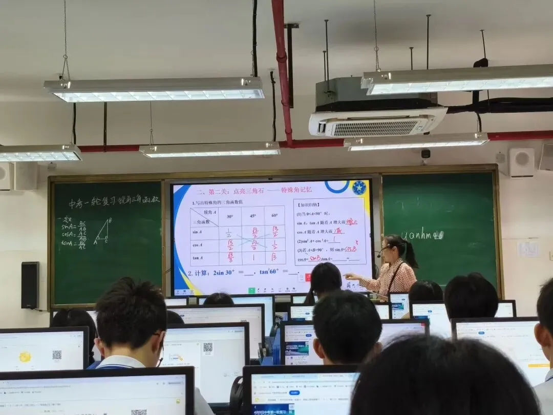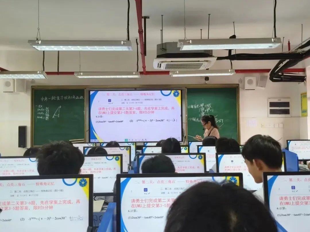 紧接着,刘少敏老师带来精彩课例展示《中考第一轮复习:锐角三角函数复习》。课堂上,刘老师充分依托UMU平台与智慧教学工具,实现任务驱动、即时反馈、互动探究一体化,将抽象的三角函数知识与可视化操作相结合,引导学生主动参与、积极思考。整堂课结构清晰、节奏紧凑,既夯实知识基础,又强化解题方法与思维训练,充分展现了技术赋能下中考数学复习课的高效与精准,为参会教师提供了可借鉴的复习课教学新模式。