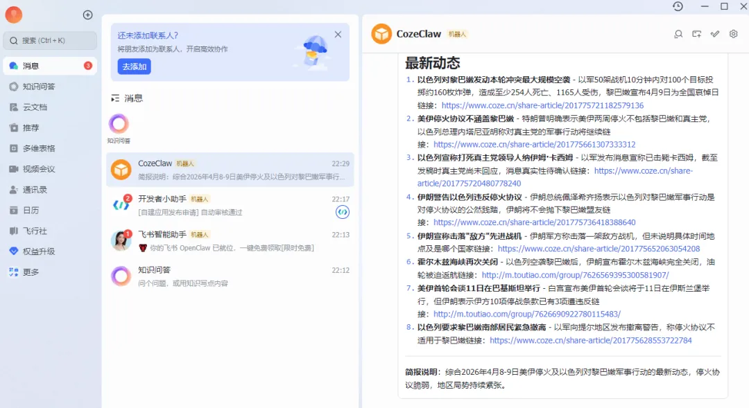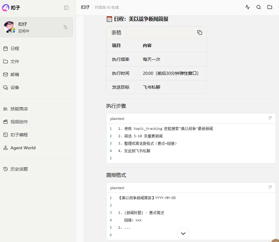 举个例子:你想每天搜集美以战争的最新新闻,整理成简报发到飞书群。