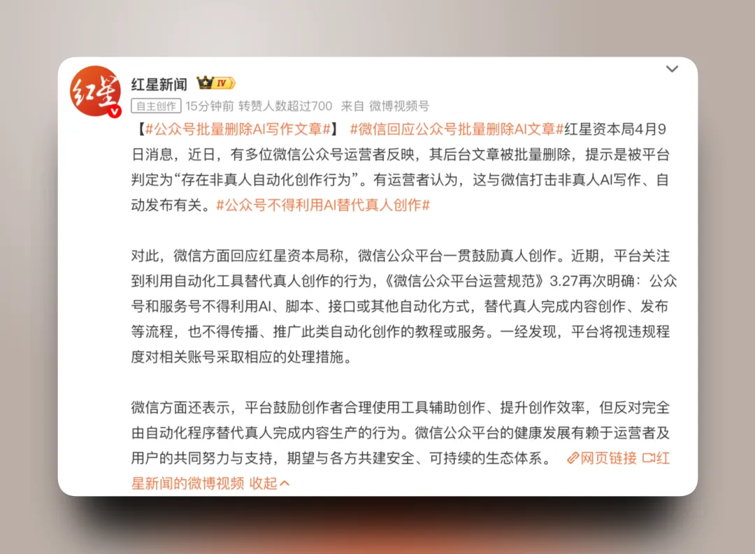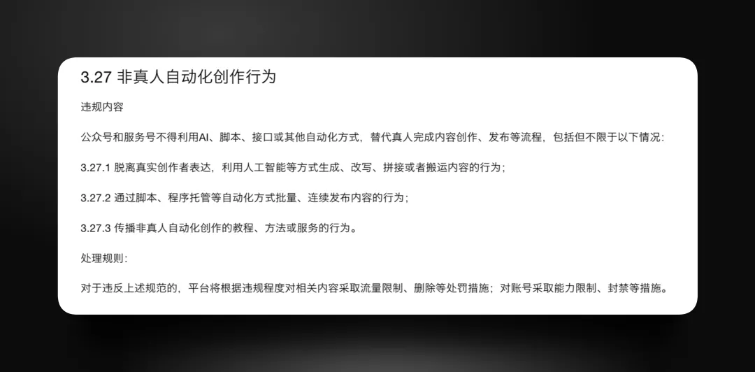 对此微信团队向记者回应称,近期平台关注到利用自动化工具替代真人创作的行为,《微信公众平台运营规范》相关规定再次明确:公众号和服务号不得利用AI、脚本、接口或其他自动化方式替代真人完成内容创作、发布等流程,也不得传播、推广此类自动化创作的教程或服务。一经发现,平台将视违规程度对相关账号采取相应的处理措施。