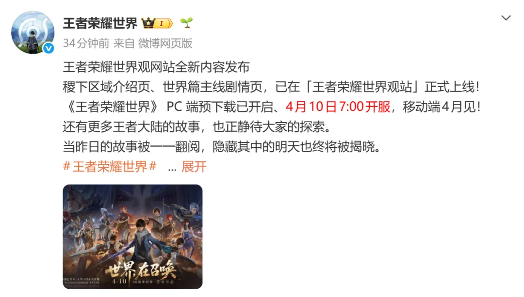 今晚,腾讯《王者荣耀世界》官方在微博发布: PC 端预下载已开启、4月10日7:00开服,移动端4月见!此次首发英雄共鸣包括元流之子、东方曜、西施、蒙犽、鲁班大师、孙膑、王昭君、伽罗、花木兰、铠、冷春(S0赛季原创英雄)等。《王者荣耀世界》承袭王者荣耀IP东方幻想题材与世界观设定,承载玩家与英雄之间的情感共鸣,构建峡谷玩家们虽未曾踏足,却早已熟悉的王者大陆。依托王者IP庞大的用户基础与腾讯成熟的运营经验,本作旨在打造兼具多人共玩乐趣与探索英雄故事的王者世界。《王者荣耀世界》官方今天还发布了多项开服活动:4月10日-5月10日在网吧完成注册创角,登录wegame活动页,即可领取专属游戏道具。提高角色波流等级,即可抽取Q币,100%概率中奖。完成简单任务可以获得抽奖机会,奖池中包含:Airpods 4、蜜氪定制键盘、RTX 5080显卡、大疆pocket3和黑寡妇V3键盘。去指定门店完成注册,还可以领取限定面饰。