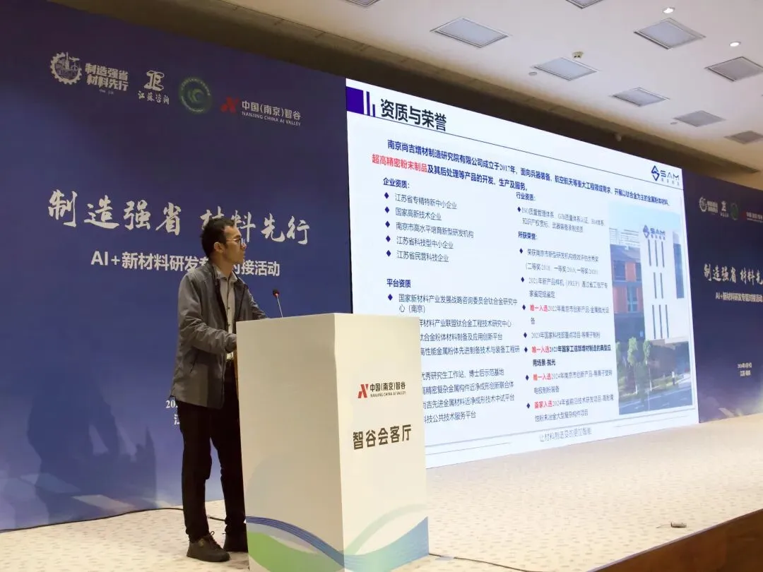 在技术交流环节,南京尚吉增材制造研究院有限公司副总经理李永华作《数智赋能,材创未来——南京尚吉AI+新材料探索与实践》主题分享,详细介绍了AI技术在企业方案制订、知识库搭建等场景的应用成效。