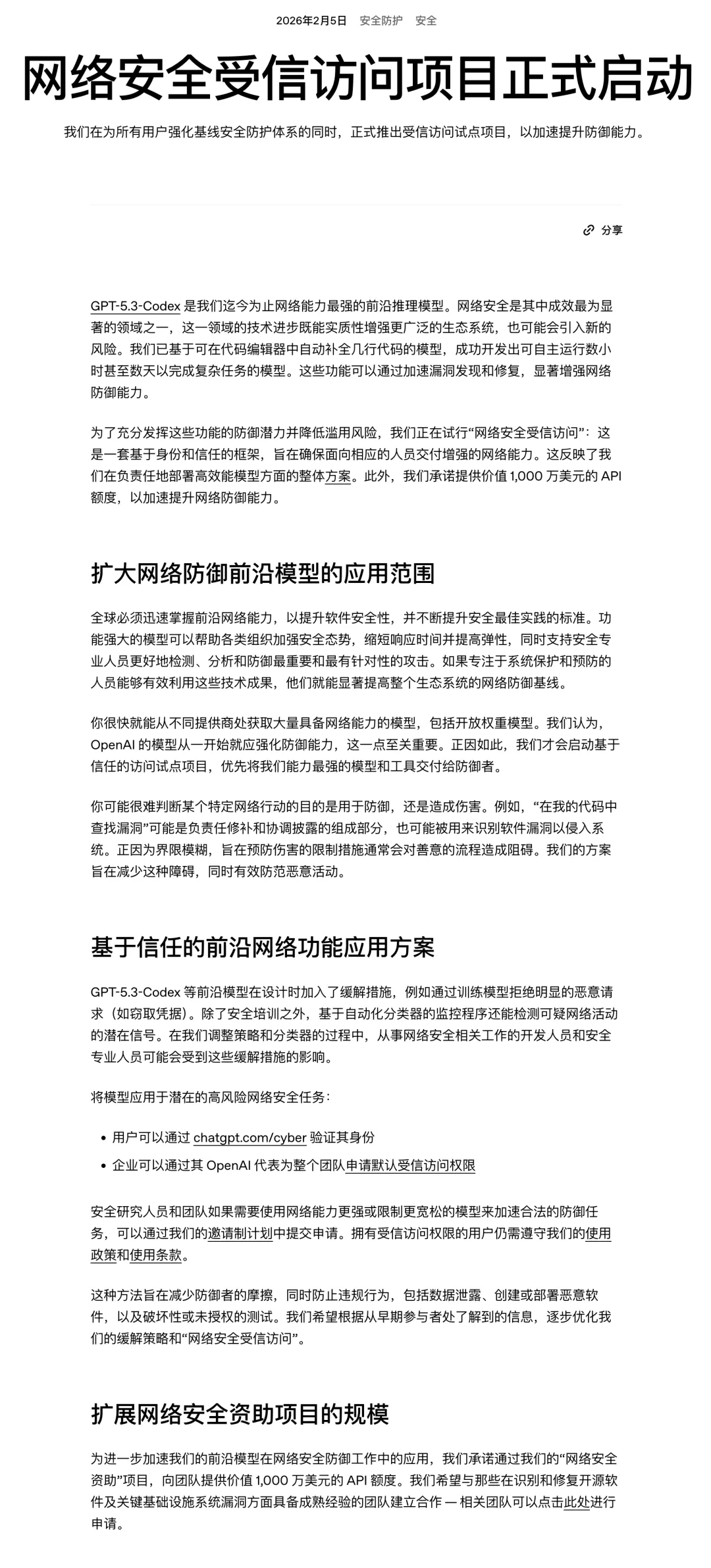 OpenAI 在今年 2 月推出 GPT-5.3-Codex 后,启动了 “Trusted Access for Cyber” 试点项目。
