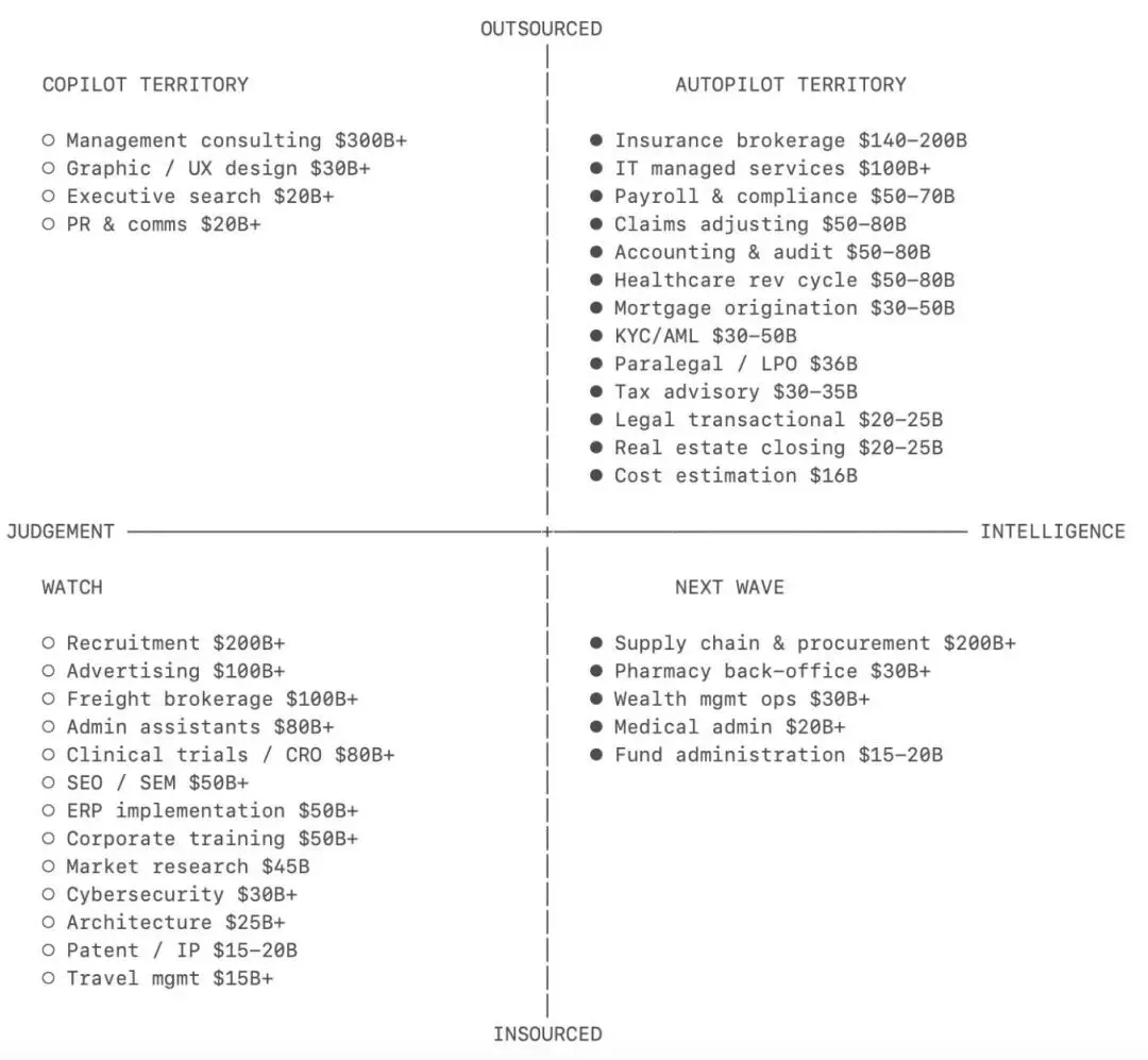 保险经纪(1400-2000亿)、IT托管服务(1000亿+)、薪资合规(500-700亿)、会计审计(500-800亿)、房产交易(2000-2500亿)