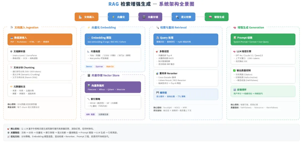1. 文档摄入管道(左侧橙色区):原始文档经过解析、分块、元数据标注后,进入向量化阶段。分块质量是整个系统的地基 2. 向量化与存储(中左区):文本 chunk 通过 Embedding 模型编码为高维向量,写入向量数据库并建立 ANN 索引 3. 检索与重排(中右蓝色区):用户查询经过意图识别和查询改写后,通过多路召回(向量 + BM25 + 知识图谱)获取候选文档,Reranker 精排后输出最终上下文 4. 增强生成(右侧绿色区):检索结果与用户问题组装成 Prompt,送入 LLM 生成带引用的回答,并通过质量控制模块检测幻觉和一致性