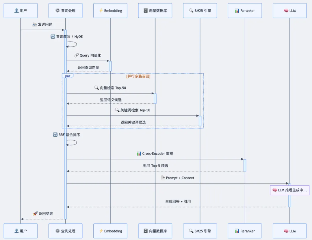 图 3:在线检索-生成时序图——从用户提问到增强回答的完整调用链