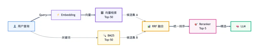 图 4:混合检索流水线——向量检索 + BM25 双路召回经 RRF 融合后由 Reranker 精排