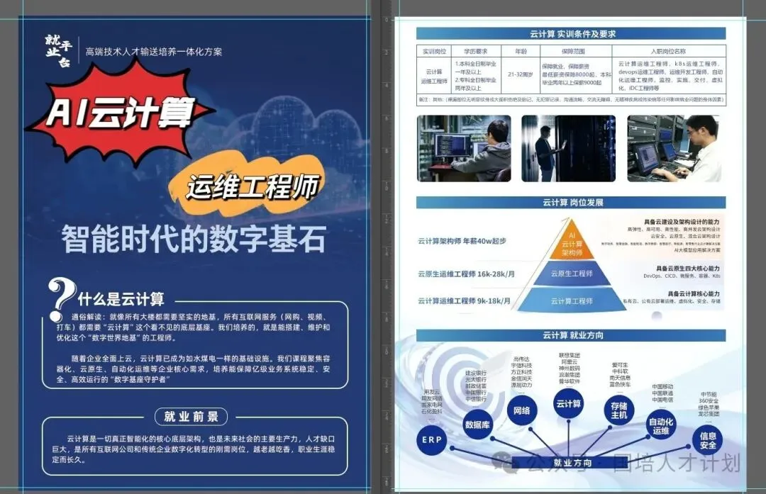 国家战略性新兴产业的数字化融合,核心是云为底座、数为要素、AI为引擎,推动各行业效率跃升;AI云计算运维工程师是这场变革中保障系统稳定、安全与高效的关键岗位,需求旺盛、价值高、路径清晰。《“十四五”数字经济发展规划》加快AI云平台、AI大数据中心、AI算力基础设施建设、推动企业上云、行业数字化转型、数据安全治理;《加快数字人才培育支撑数字经济发展行动方案(2024—2026)》,AI云计算工程技术人员,纳入国家职业标准与数字技术工程师培养项目;《数据产业高质量发展指导意见》(2024),建设云数据中心、智能计算中心、算力集群、强化云运维、数据安全、算力调度人才供给;二十届三中全会 + 十五五规划方向,健全“实体经济与数字经济深度融合”制度、发展“智算云、混合云、云原生、国产自主云”、云计算运维是“新质生产力”关键技术岗等国家核心政策。找放心的工作,找放心的人。
