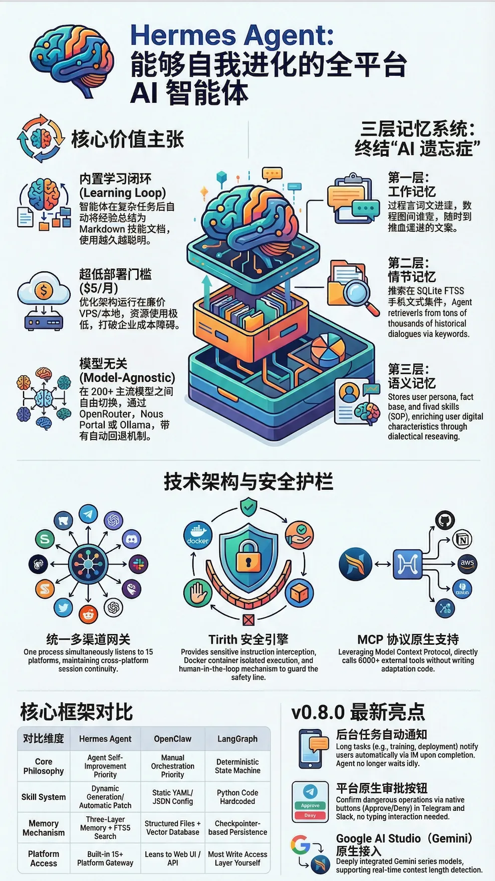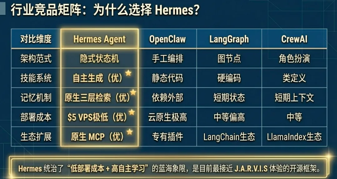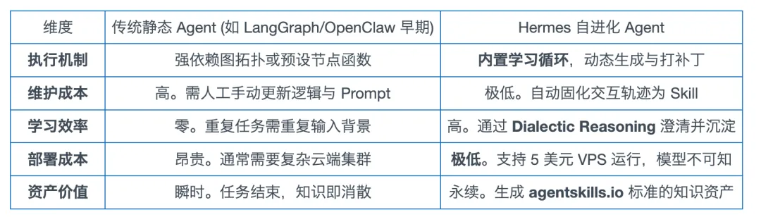总结过渡: Hermes 的核心价值主张在于其内置学习循环,这使得它能将“交互轨迹”转化为“核心资产”,从而打破传统架构的静态僵局。