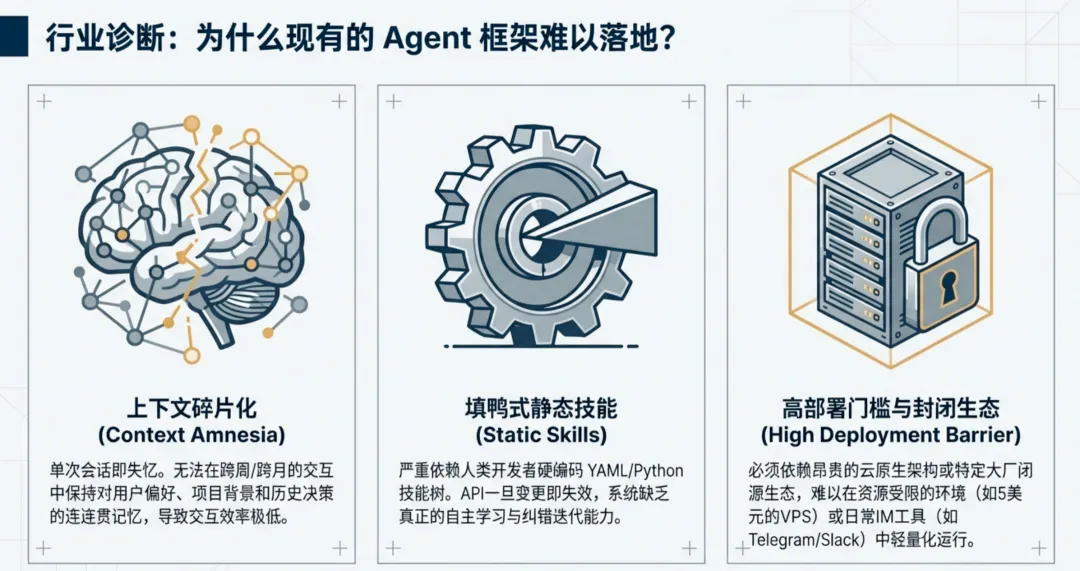 站在 2025-2026 年的 AI 节点回望,AI Agent 市场正经历一场从“被动工具”到“数字资产”的深刻演进。在 OpenAI Agents SDK、LangGraph 等框架爆发式增长的背景下,Nous Research 推出的 Hermes Agent 以其独特的“自进化”能力被誉为“年轻人的第一个爱马仕”。它不仅是一个执行指令的脚本,更是一个能通过内置学习循环 (Learning Loop) 自我提炼知识的生命体。当前企业在 Agent 落地中普遍面临四大“战略围墙”: