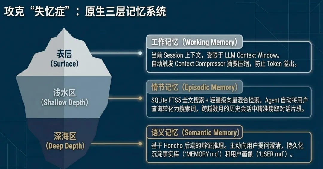 Hermes 模拟人类大脑功能,设计了三层纵深记忆架构: