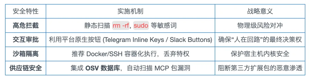 为了连接私有数据,Hermes 构建了 Tirith 安全防护引擎,其实施矩阵如下: