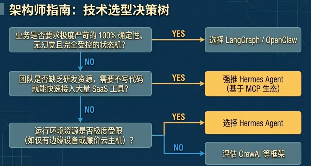 是否需要快速接入大量 SaaS 且无强开发资源? -> 是 -> Hermes Agent (MCP 生态)。