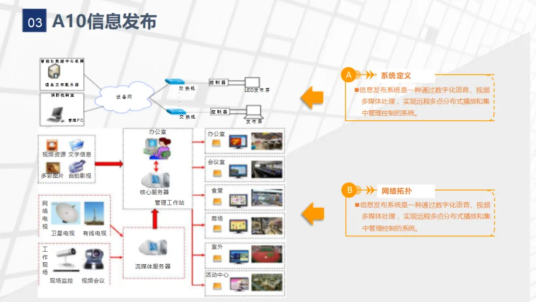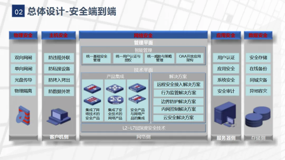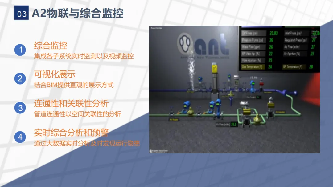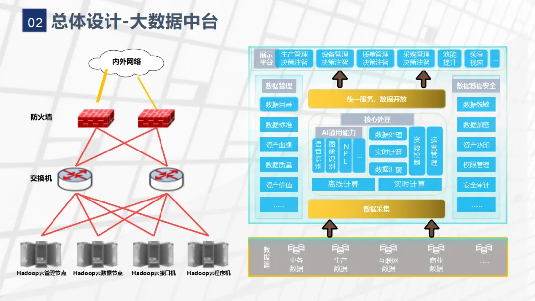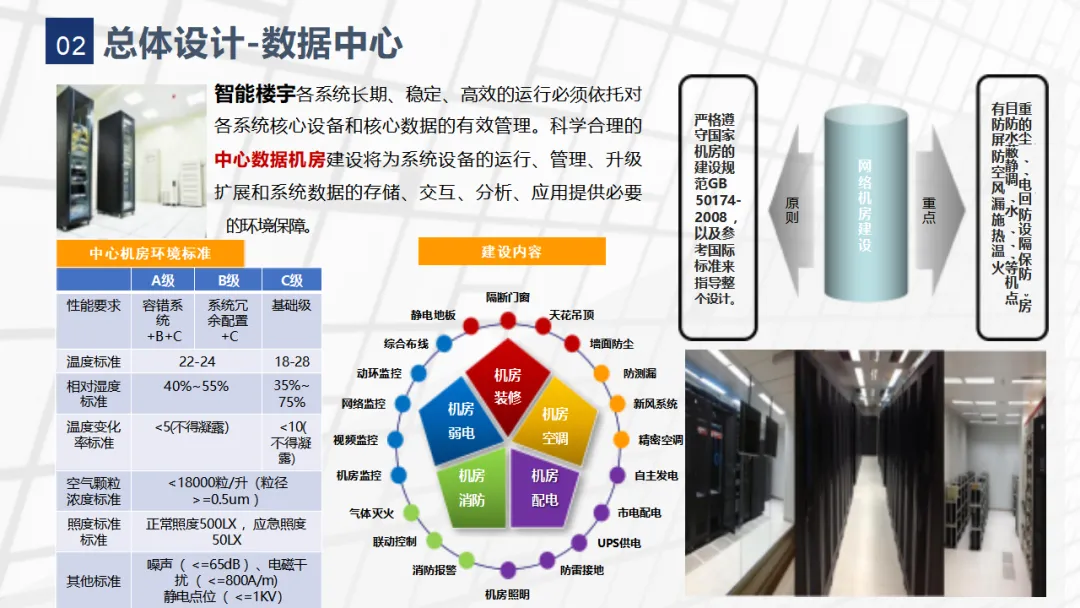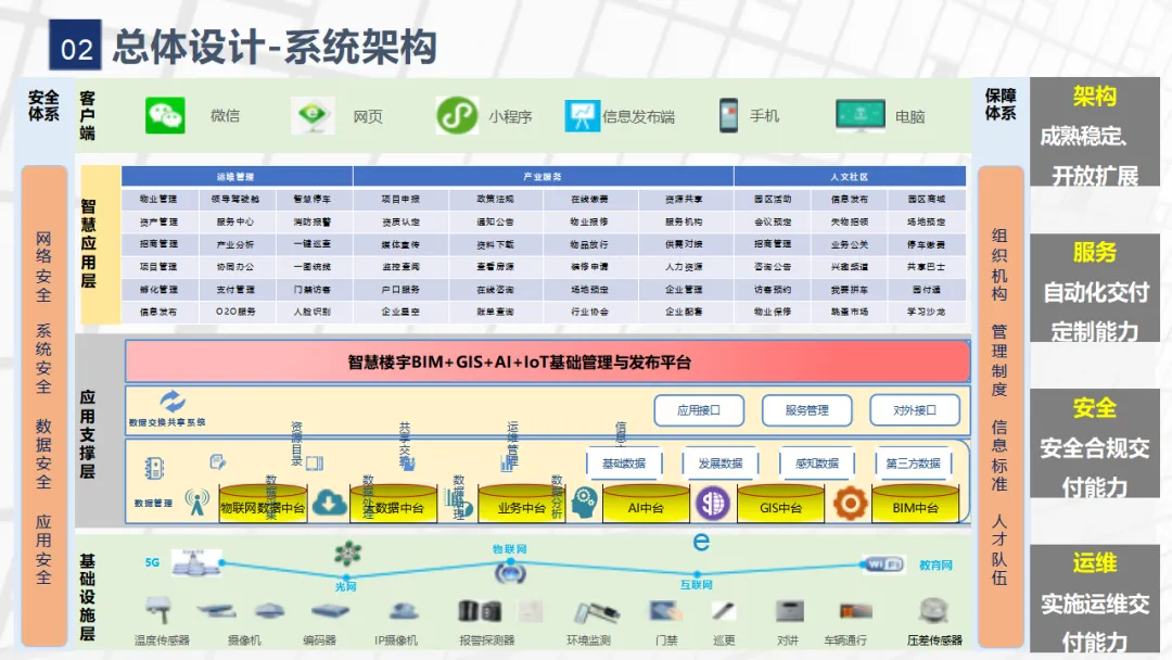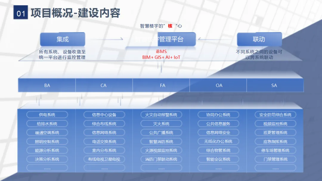 方案以iBMS智慧楼宇管理平台为核心,整合BIM、GIS、AI、IoT技术,将BA楼宇自控、CA通信自动化、FA消防自动化、OA办公自动化、SA安防自动化五大系统统一接入,实现设备跨系统联动与集中管控。整体架构分为基础设施层、应用支撑层、智慧应用层,配套完善安全体系与保障体系,兼顾稳定、扩展、安全与可运维性,同时搭建云平台与大数据中台,支撑数据采集、治理、分析与共享。