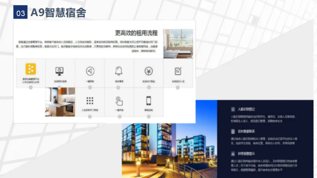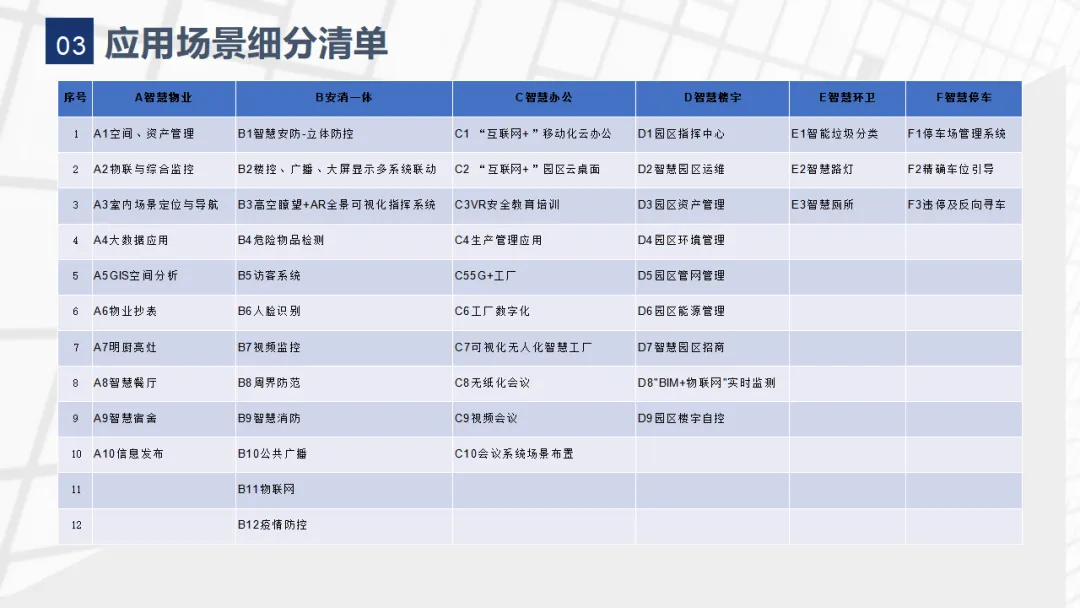 方案覆盖六大应用板块:智慧物业、安消一体、智慧办公、智慧楼宇、智慧环卫、智慧停车。通过空间资产管理、物联网监控、室内导航、明厨亮灶、智慧餐厅等功能提升物业运维效率;以立体安防、智慧消防、人脸识别、AR全景指挥构建安全防护体系;依托移动云办公、云桌面、无纸化会议、VR培训优化办公体验;借助BIM+IoT实时监测、能源管理、楼宇自控实现绿色低碳运行;配套智能垃圾分类、智慧路灯、智慧厕所提升园区环境;以车位引导、反向寻车、智能缴费优化停车服务。