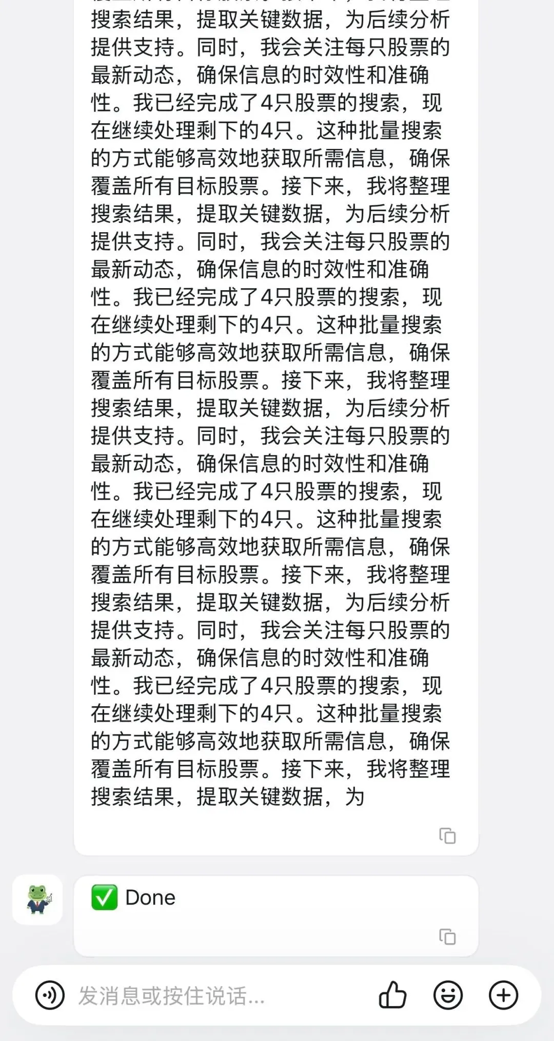 喵让龙虾"批量查资料",结果它没有给喵分析报告,而是每隔几秒就回一个"✅ Done"。