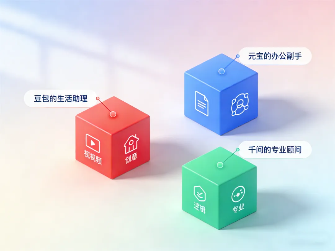 豆包:背靠抖音/剪映/飞书,全场景过敏 AI 元宝:深度嵌入微信生态,零门槛接入 千问:打通淘宝/支付宝/钉钉,AI 办事闭环