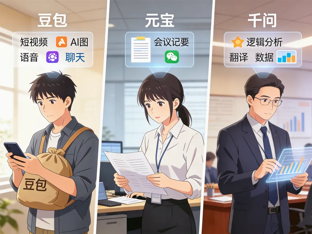 豆包像全能生活助理,什么都能干,响应快,接地气 元宝像微信办公副手,轻量便捷,生态整合强 千问像专业顾问,严谨准确,适合复杂任务