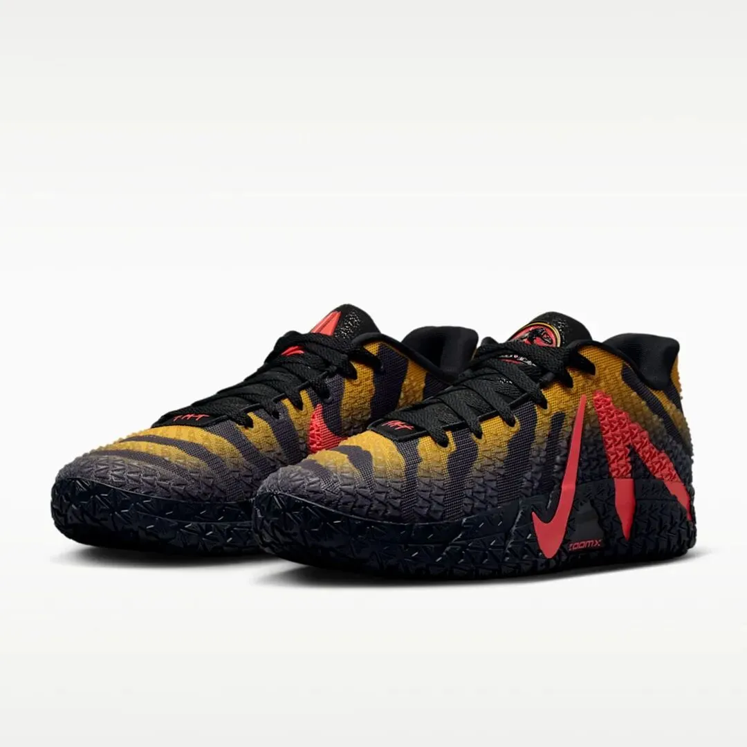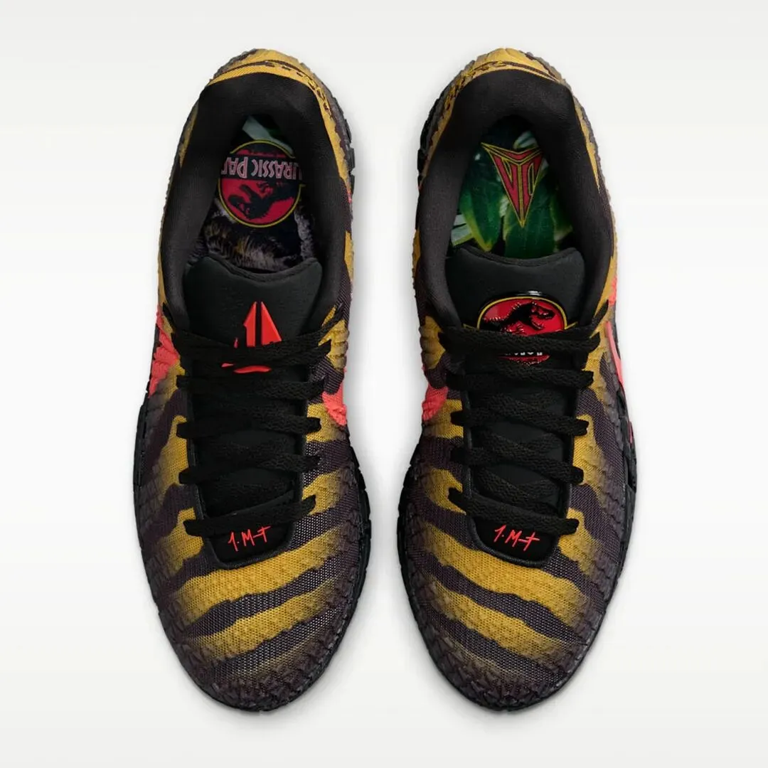鞋款设计灵感源自灵活敏捷的“掠食者”,助你如同赛场上的迅捷猎手,让对手难测行踪。煤黑和赭黄鞋身,搭配经典亮深红爪痕设计,辅以涂鸦风格“A”字(代表“Ja”),鞋侧不对称亮深红 Swoosh ,其他细节包括鞋舌带有 Jurassic Park 字样和掠食者图案,彰显鞋款身份。后跟外底刻有“Twelve”字样,致敬莫兰特的 12 号球衣,搭载锯齿状 Zoom 外底,最后以黑色橡胶外底呼应鞋身。售价:899 元/699 元