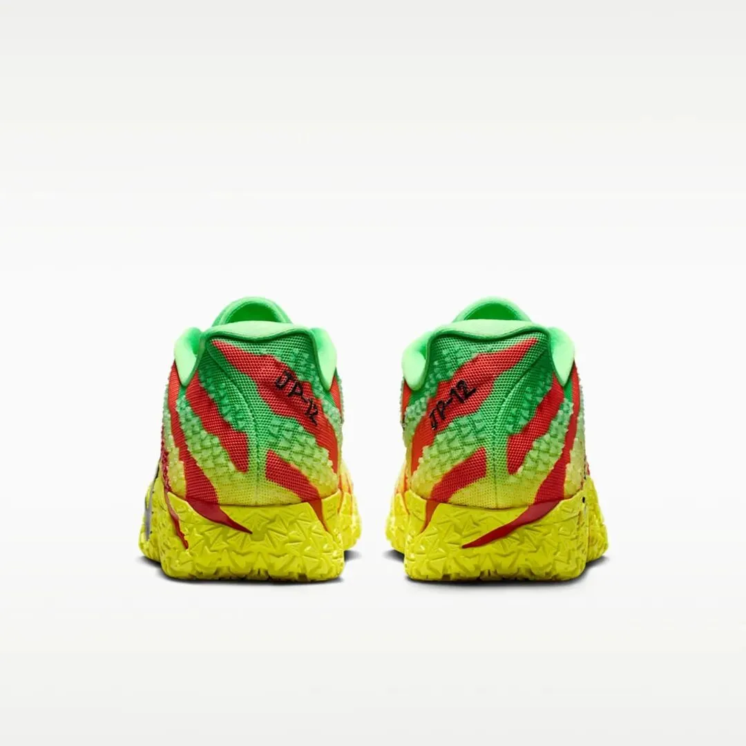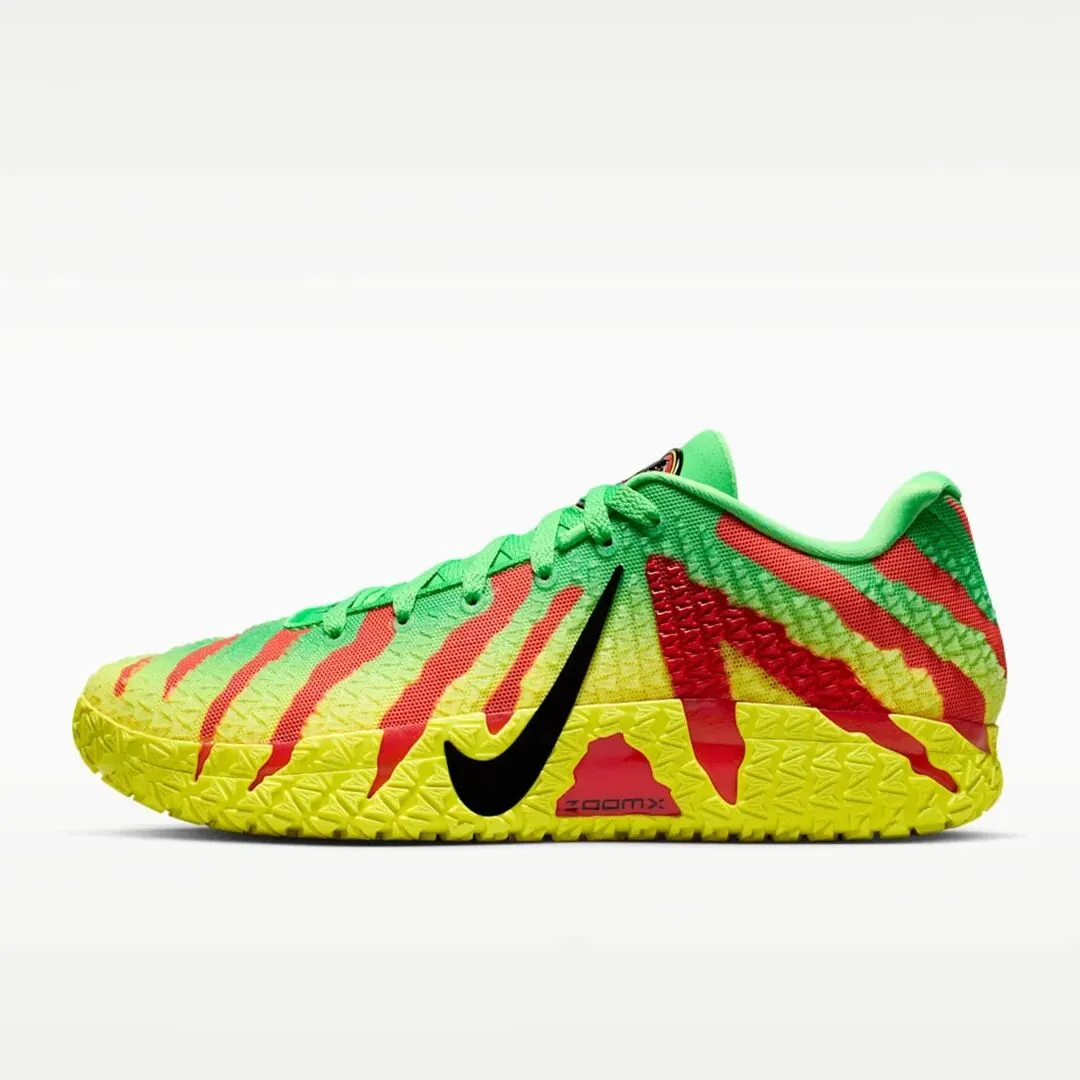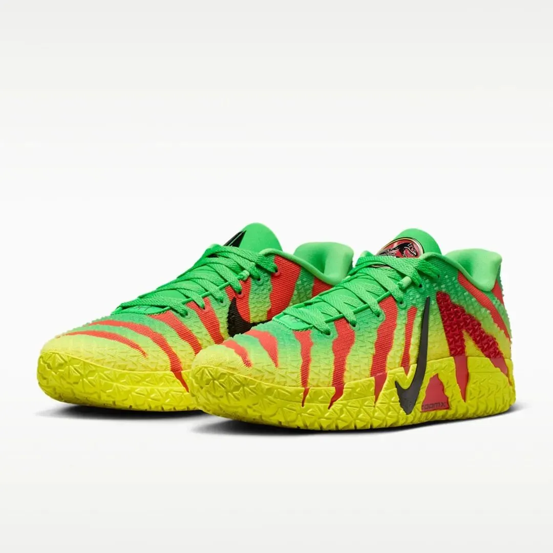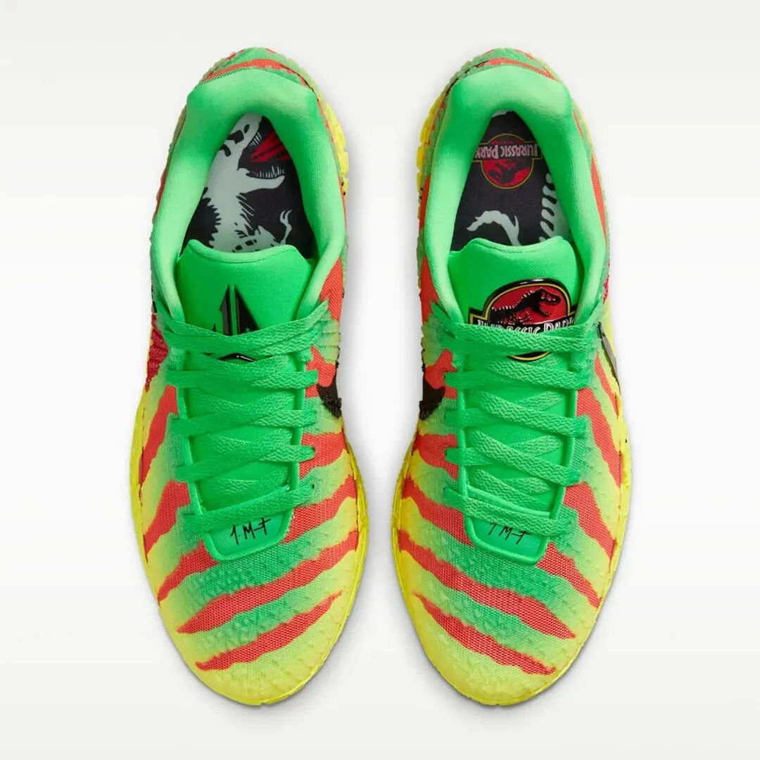 鞋款形容莫兰特像翼手龙一样在空中扣篮,或像霸王龙一样冲向篮筐时,你一定要做好准备,以莫兰特喜爱的电影之一为灵感,采用粗犷风格作为设计元素。清爽闪亮绿鞋身,搭配大学红爪痕设计,鞋侧不对称黑色 Swoosh ,其他细节包括鞋舌带有 Jurassic Park 字样和掠食者图案,彰显鞋款身份。后跟外底刻有“Twelve”字样,搭载锯齿状 Zoom 外底,最后以活力黄橡胶外底完善设计。售价:899 元/699 元