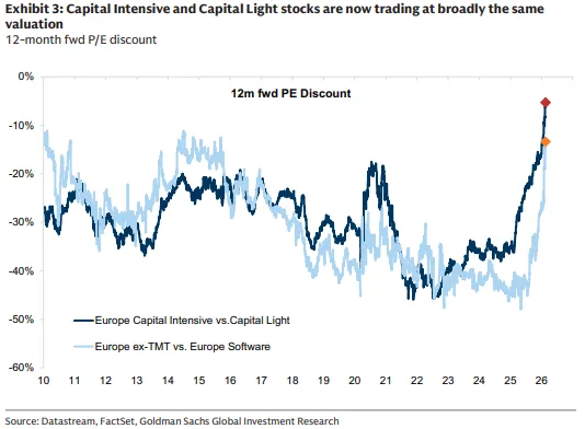 由此,**重资本**与轻资本企业之间的估值差距显著收窄。图表3显示,两类企业目前估值已基本趋同;更重要的是,这一收敛主要由重资本企业估值重估推动,而非轻资本企业整体估值下调。除软件等少数直接受人工智能冲击的轻资本领域表现疲软外,是重资本企业估值向上靠拢轻资本企业,而非相反。