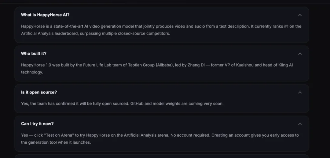 HappyHorse 官网显示:由 Taotian Group(阿里淘天集团)Future Life Lab 开发,负责人 Zhang Di
