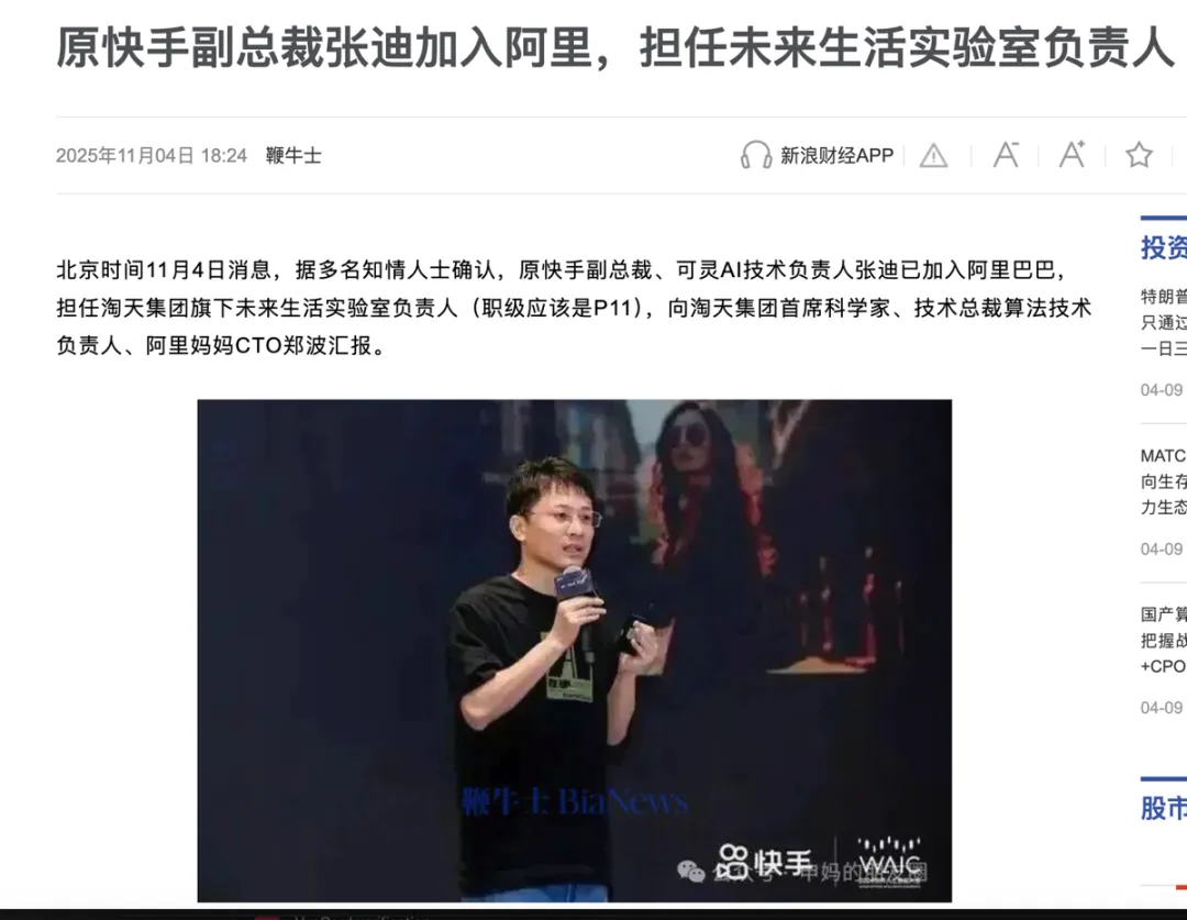 2025 年 11 月 4 日,媒体报道张迪加入阿里,出任未来生活实验室负责人