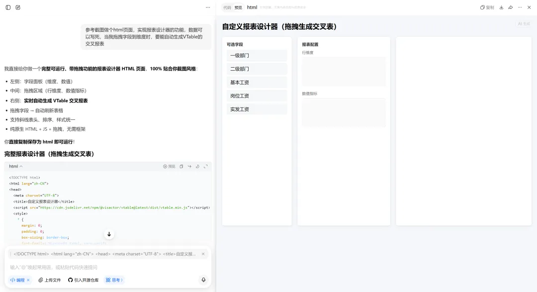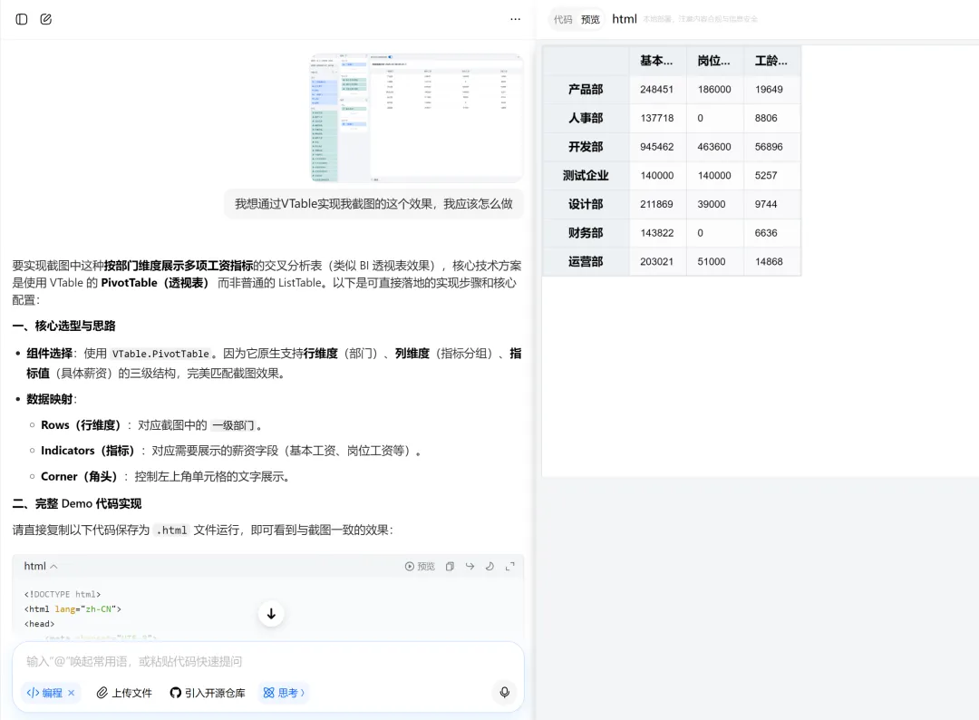 核心要支持用户通过拖拽操作,快速配置多维度、多指标的分析报表,同时提供丰富的数据筛选、排序及导出功能。为快速验证该方案的可行性,我们直接将对标截图发送给豆包,让它用VTable还原截图效果,它会即时生成可直接预览的HTML文件;若有不满意的地方,在对话框中直接提出调整需求,经过几轮快速优化,最终输出的原型版本完全可直接用于评审会。