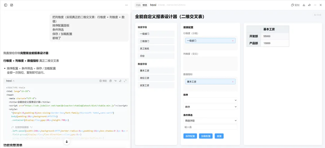 设计原型界面最耗时,尤其是可交互原型,如果用Axure设计,从拖拽布局、微调组件,到搭建一页页动态面板、编写交互逻辑,哪怕是一个简单的需求,也得耗费好几天时间。最近使用豆包实现了一个自定义报表的需求快速变成可交互的原型。