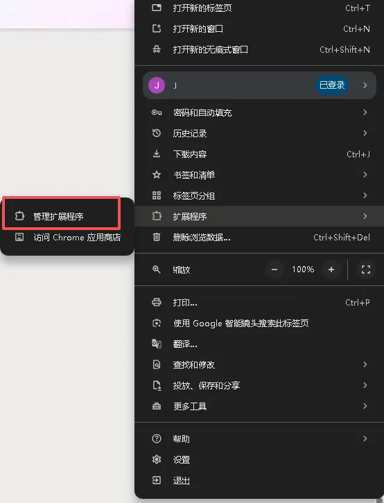 打开chrome的【管理扩展程序】: