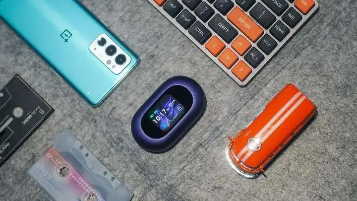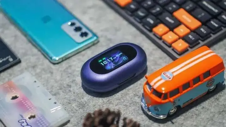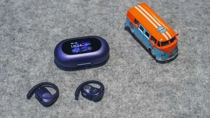 虽然之前TOZO已经有带屏的产品,但只是显示电量。而这次Open X2 Pro最明显的特点就是加入了1.75寸的高清彩屏,加上紫色的配色,屏幕主题和外观颜色相呼应,一体感很强,非常有辨识度。整体外观使用了简约圆润的跑道圆造型,握在手里很舒适。