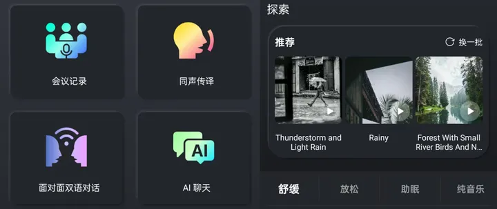 AI板块支持会议记录,同声传译、面对面的对话以及AI聊天。会议场景下支持智能笔记,语音转文字,大大提升效率。同时内置大语言模型 AI 助手,支持自然对话、实时问答、多轮交互。无论是查询天气、设置提醒、翻译语言,还是创意写作、知识咨询,只需语音指令,即可快速响应,实现 “解放双手,高效沟通”。