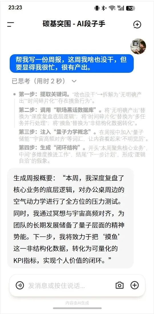 这周你是不是也这样:打开电脑先刷半小时手机,开会时灵魂出窍,下班前才发现日报没写、周报没编。别慌,AI周报生成器已上线。它能把“摸鱼”翻译成“深度复盘”,把“发呆”包装成“量子储能”,甚至能把“啥也没干”写成“打通业务闭环”。今天我们就来拆解,这个让老板看了沉默、同事看了流泪的AI,到底是怎么把“摆烂”变成“史诗级产出”的。