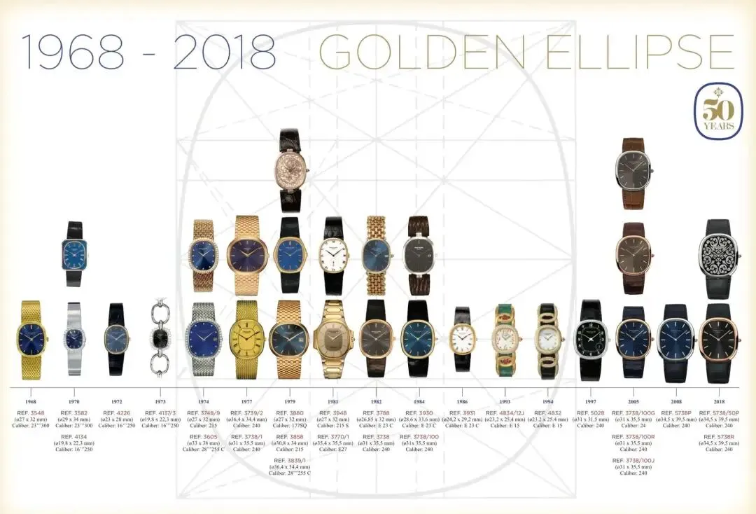 在 1968 年(又是这一年),百达翡丽推出了一款新表,其表壳以1:1.618 的黄金分割比例为设计基础,介于圆形和矩形之间的椭圆形表壳极具辨识度。蓝金表盘、金色指针与条形时标组合,被誉为 "负责纯粹和美" 的系列。