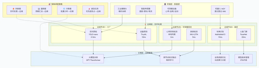 云端不再处理琐碎实时任务,专注三大核心:大规模模型训练、全局数据聚合、复杂决策优化。比如训练千亿参数大模型、分析全国工业设备运行大数据、制定跨区域供应链调度策略 —— 用最强算力解决 "全局性、高复杂度、非实时" 问题,算力利用率从 40% 提升至 80%。