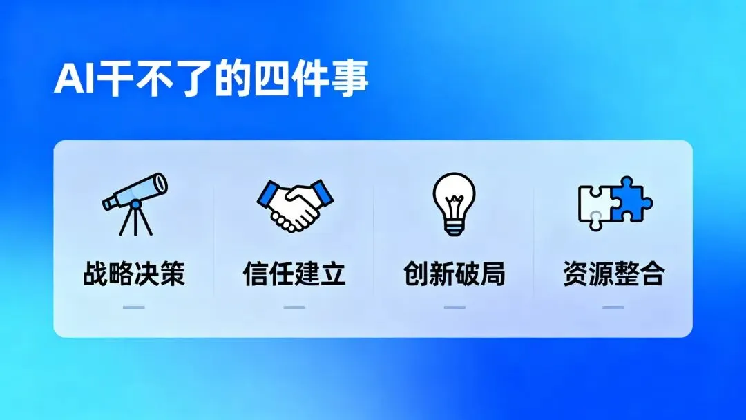 你花十万块做个咨询,你是愿意找个真人顾问跟你深度沟通,还是愿意让AI给你方案? 你买几十万的定制家具,你是愿意跟老板直接聊你的需求,还是让AI跟你对接? 你加入一个社群,你是因为相信主理人才来的,还是因为相信AI才来的?