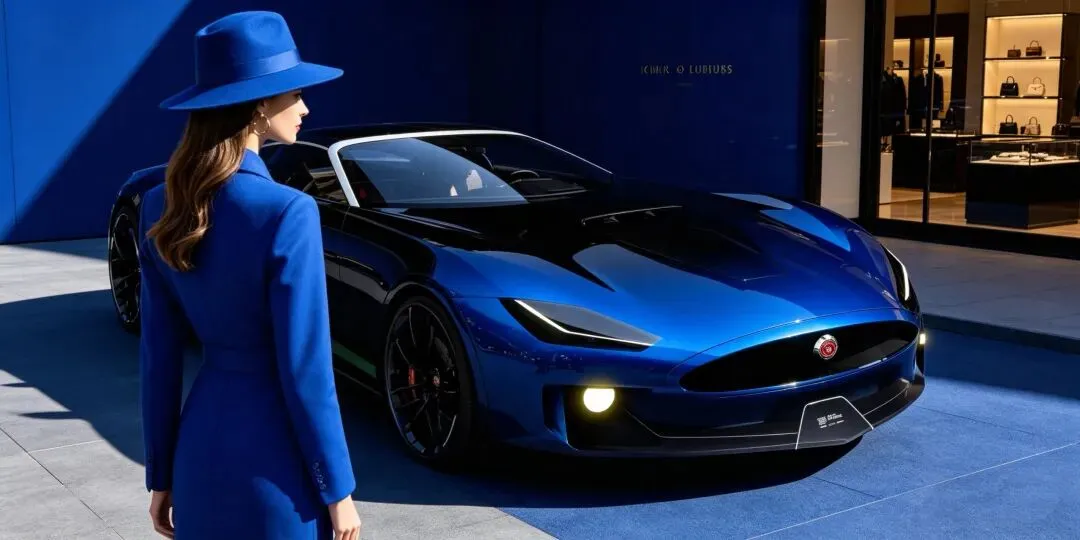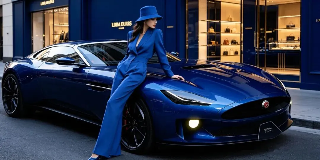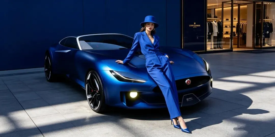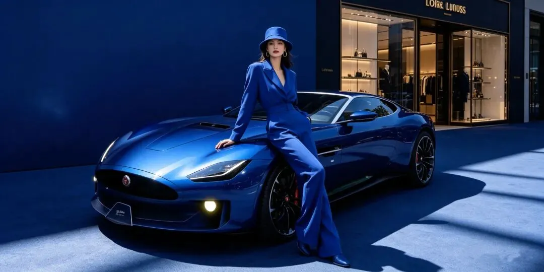 “LUNA LUNA'S PENNO”旗舰店外,蓝色捷豹GT静静停驻。这是品牌与时尚品牌的联名秀,小林的设计成为全场焦点。一位身着同色系西装套装的模特倚靠车侧,红唇与红色卡钳遥相呼应。