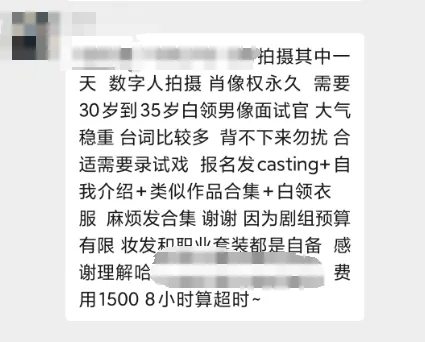 “数字人拍摄,肖像权永久,费用1500元。”演员卢佳向每经记者发来她所在的一个通告群中的截图,有公司正在寻找AI艺人。